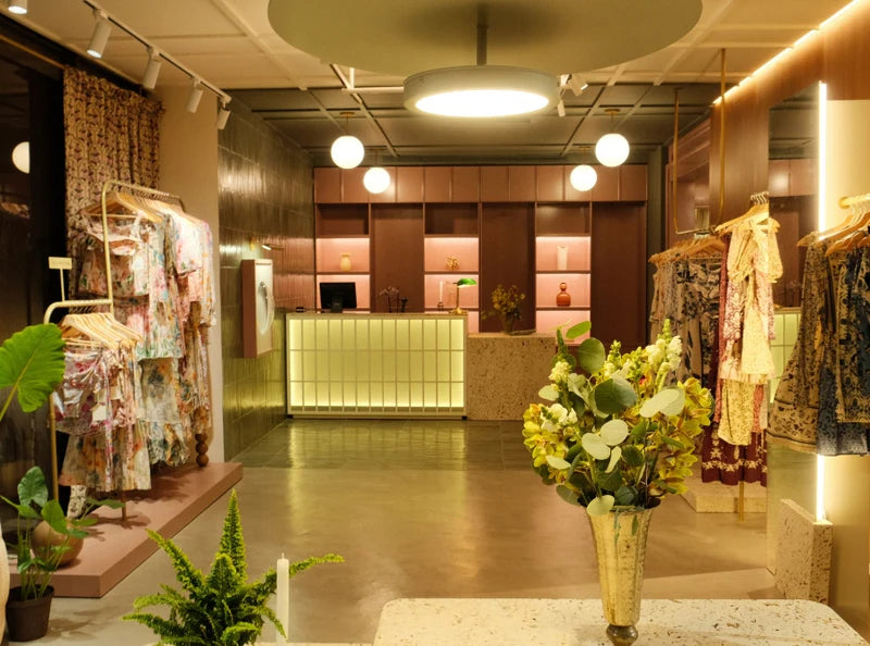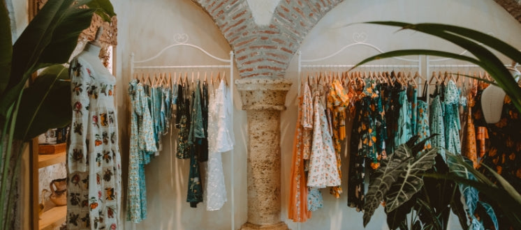 Located in the enchanting city of Cartagena, our flagship store is an ode to warm weather and captivating historic architecture. With beautiful adobe brick arches, floors in green checkered tiles that mirror the lush nature outside, and delicate iron racks made by local artisans, this space features a special nook adorned with one of our very first sewing machines and a stunning dress from our first collection that wonderfully represents the essence of our brand.